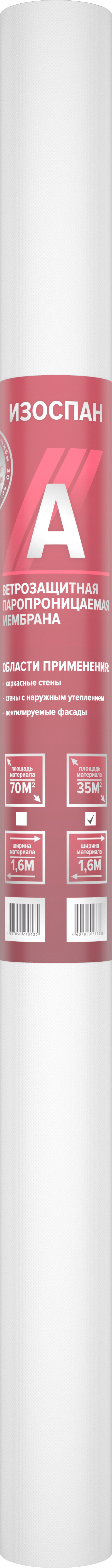 Изоспан A (70м2) — термоскрепленный полипропиленовый нетканый материал. Ветрозащитная мембрана Изоспан A препятствует конвективному движению воздуха через теплоизоляцию, снижая теплопотери. Изоспан A обладает водоупорностью, достаточной для защиты утеплителя и других внутренних элементов конструкций стен от атмосферных осадков, проникающих под наружную обшивку, при этом является паропроницаемым материалом, поэтому не препятствует выходу водяных паров из утеплителя в вентилируемый зазор. Прочность материала способствует устойчивости к механическим нагрузкам на этапе монтажа и в процессе эксплуатации.