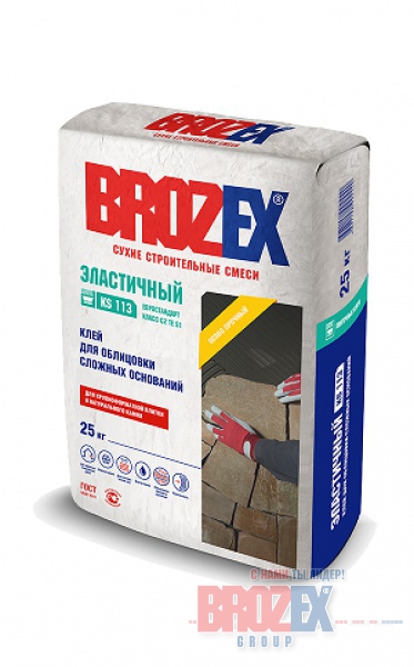 Клей BROZEX KS113 Эластичный предназначен для монтажа керамической плитки, керамогранита, плит из натурального камня. Лучше всего взаимодействует с бетонными основаниями, кирпичными, каменными, с цементной или гипсовой штукатуркой. С BROZEX KS113 легко выполнить облицовку для бассейна, фасада и т.д.