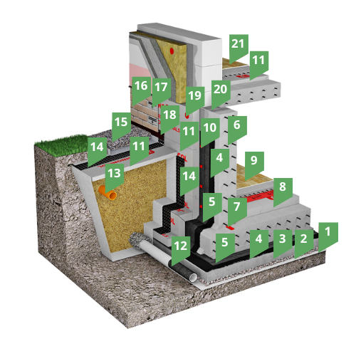 В качестве гидроизоляционной мембраны рекомендуется использовать рулонный битумно-полимерный наплавляемый материал Техноэласт ФУНДАМЕНТ в два слоя, обеспечивающий повышенные требования к изоляции эксплуатируемых помещений.