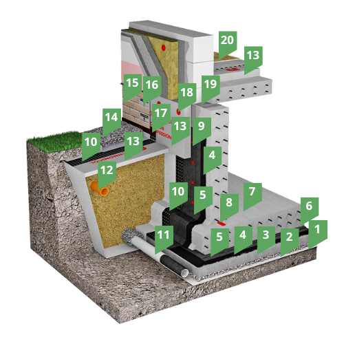 В качестве изоляции фундаментной плиты используется система ПОЛ Гидро КМС.