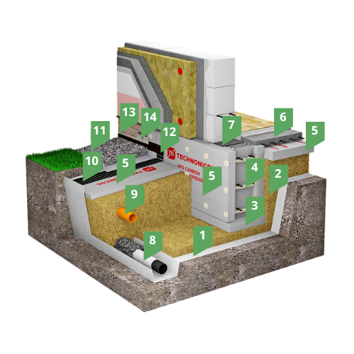 В качестве теплоизоляционного материала для вертикальной части фундамента и отмостки используется экструзионный пенополистирол марки ТЕХНОНИКОЛЬ CARBON ECO, который обладает низким водопоглощением и высокой прочностью на сжатие. Под подошвой фундамента и в конструкции пола используется экструзионный пенополистирол марки ТЕХНОНИКОЛЬ CARBON ECO SP, обладающий повышенными прочностными показателями. Технология несъемной опалубки с применением экструзионного пенополистирола XPS ТЕХНОНИКОЛЬ CARBON ECO и Модульных элементов стяжек несъемной опалубки ТЕХНОНИКОЛЬ позволяет выполнять фундаментную ленту необходимой ширины под любой тип стен.