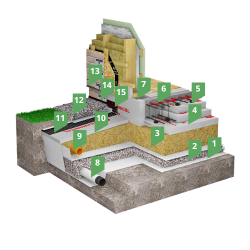 В качестве теплоизоляционного материала используется экструзионный пенополистирол марки ТЕХНОНИКОЛЬ CARBON ECO SP, который обладает низким водопоглощением и высокой прочностью на сжатие. Для легких каркасных, одноэтажных каменных и деревянных домов допускается в качестве основного слоя использовать экструзионный пенополистирол ТЕХНОНИКОЛЬ CARBON ECO SP Light, в остальных случаях и под ребра жесткости для любого типа домов экструзионный пенополистирол ТЕХНОНИКОЛЬ CARBON ECO SP.