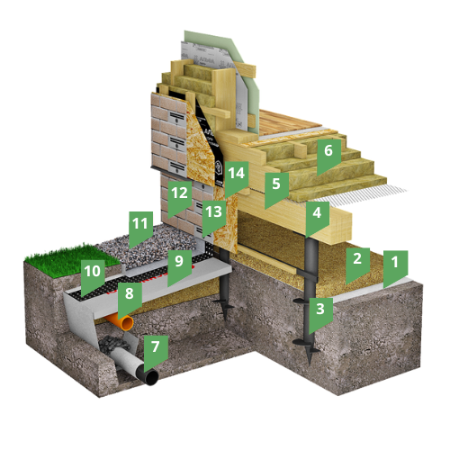 Система состоит из металлических винтовых свай, объединенных балкой-ростверком. После установки свай в проектное положение их внутренняя полость заполняется цементно-песчаным раствором для предотвращения коррозионных процессов. На всю площадь поверхности оголовка сваи, либо ростверка (в случае металлического ростверка) укладывается отсечная гидроизоляция ТЕХНОНИКОЛЬ. Это необходимо для защиты деревянных конструкций здания от возможного воздействия влаги. Цокольная часть здания закрывается фасадной плиткой Hauberk, которая крепится на основание из плит OSB.