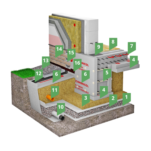 В качестве теплоизоляционного материала для вертикальной части фундамента и отмостки используется экструзионный пенополистирол марки ТЕХНОНИКОЛЬ CARBON ECO, который обладает низким водопоглощением и высокой прочностью на сжатие. Под подошвой фундамента и в конструкции пола используется экструзионный пенополистирол марки ТЕХНОНИКОЛЬ CARBON ECO SP, обладающий повышенными прочностными показателями. Технология несъемной опалубки с применением экструзионного пенополистирола XPS ТЕХНОНИКОЛЬ CARBON ECO и модульных элементов стяжек для несъемной опалубки позволяет выполнять фундаментную ленту необходимой ширины под любой тип стен. Технология позволяет производить бетонирование в одну захватку, сокращая временные затраты и количество технологических операций при возведении фундамента.