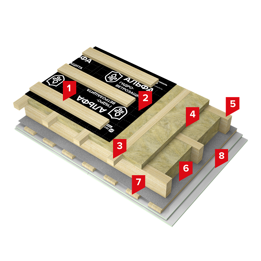 Пароизоляционная пленка ТЕХНОНИКОЛЬ АЛЬФА Барьер 4.0 располагается со стороны теплого помещения и защищает теплоизоляцию от переувлажнения изнутри. Пленка ТЕХНОНИКОЛЬ АЛЬФА ТОП, расположенная над утеплителем, защищает его от проникновения влаги, выдувания ветром тепла и фракций утеплителя.