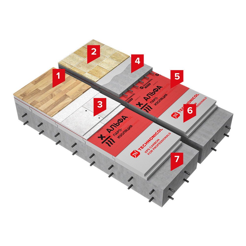 Система изоляции пола состоит из экструзионного пенополистирола ТЕХНОНИКОЛЬ CARBON ECO, который свободно укладывается непосредственно по ж/б перекрытию. При устройстве системы над холодным подвалом по слою теплоизоляции следует уложить пароизоляционный слой, который также выполняет дополнительную функцию защиты от вытекания цементного молочка из стяжки.