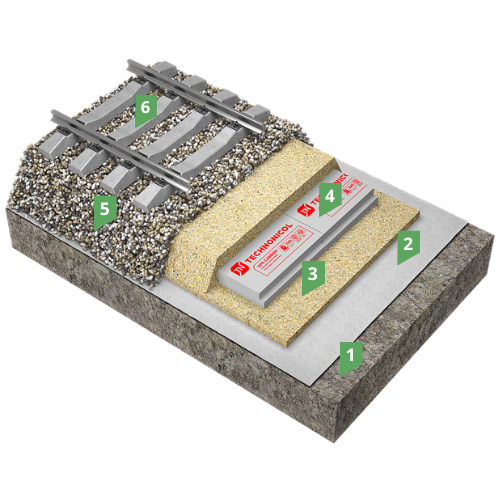 Данная система состоит из рельсо-шпальной решетки, уложенной на слой балласта. В качестве теплоизоляции применяются плиты XPS ТЕХНОНИКОЛЬ 45-500, который благодаря своим теплотехническим показателям, а также способности выдерживать длительные нагрузки и стойкости к агрессивным средам, способен успешно применяться в качестве теплоизолирующего слоя основания земляного полотна.