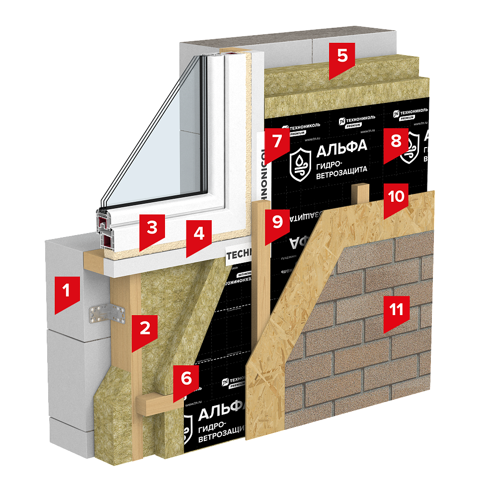 В качестве теплоизоляции в данной системе применяются легкие плиты из каменной ваты с низкой сжимаемостью – ТЕХНОБЛОК СТАНДАРТ. Для надежной фиксации теплоизоляционных плит с наружи здания к фасаду механически крепится деревянный каркас требуемой толщины. Для защиты утеплителя от выветривания и от замачивания атмосферными осадками теплоизоляционные плиты необходимо изолировать диффузионной пленкой ТЕХНОНИКОЛЬ АЛЬФА ВЕНТ ТПУ. Данная пленка фиксируется между брусками для контрутепления и контррейками, по которым в последствии монтируется сплошное основание из OSB. Фасадная плитка ТЕХНОНИКОЛЬ HAUBERK крепится на OSB механическим способом специальными оцинкованными гвоздями, двойной клеевой замок значительно облегчает процесс монтажа. Созданная на основе стеклохолста, улучшенного битума и гранул из натурального базальта фасадная плитка обладает высокой цветостойкостью и устойчивостью к температурным колебаниям. Кроме того, её отличает повышенная герметичность, а также удобство применения на любых геометрически сложных поверхностях. В системе ТН-ФАСАД HAUBERK пароизоляция не требуется. Наличие вентилируемого канала делает систему надежной, даже на основании с высокой паропроницаемостью.