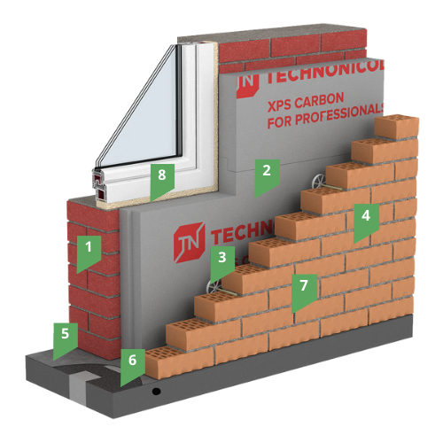 Для предупреждения образования сплошного мостика холода, в перекрытие при монолитных работах вставляются термовкладыши из экструзионного пенополистирола ТЕХНОНИКОЛЬ CARBON ECO. Обладая высокими теплотехническими свойствами и эффективным сроком эксплуатации не менее 50 лет XPS ТЕХНОНИКОЛЬ CARBON ECO применяется в качестве среднего теплоизоляционного слоя конструкции стены (высотой до 9 м).