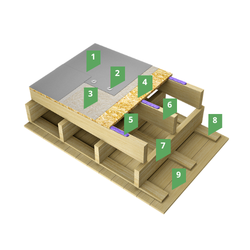 Сплошное основание в системе организовано из листов ОСП (18 мм) или фанеры ФСФ (12 мм), приклеенных к деревянным балкам полиуретановым клеем ТЕХНОНИКОЛЬ 508 PROFESSIONAL.