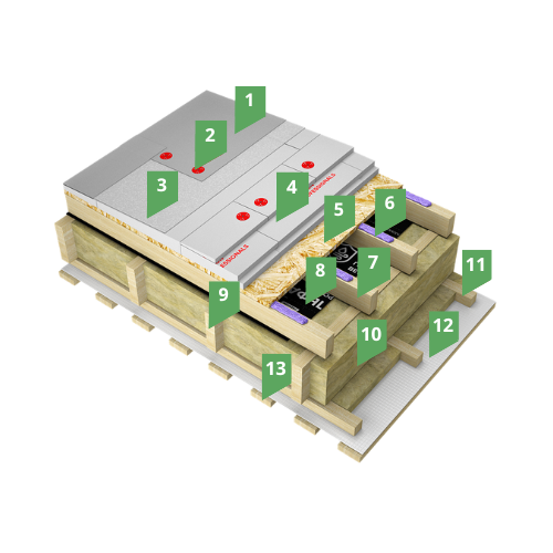 Система изоляции применяется при устройстве плоских совмещенных кровель, выполненных по конструкциям на основе деревянного каркаса. Особенностью системы является наличие вентилируемого зазора, организованного деревянной обрешеткой.