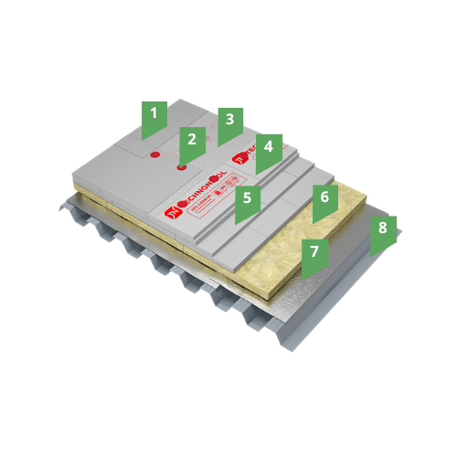 Кровельный ковер выполняется из полимерной мембраны LOGICROOF V-RP, которая имеет высокие противопожарные характеристики – Г2, РП1 и В2. В случае применения определенных марок и толщин ПВХ мембран ТЕХНОНИКОЛЬ конструкция соответствует группе пожарной опасности кровли КП0, что позволяет применять систему на максимальной площади кровли до 10 000 м2 без устройства противопожарных поясов. Для устройства теплоизоляционного слоя применяется два типа утеплителя. В качестве нижнего слоя теплоизоляции применяются негорючие плиты из каменной ваты ТЕХНОРУФ Н ПРОФ толщиной не менее 50 мм, что обеспечивает системе высокие противопожарные характеристики. В качестве верхнего слоя теплоизоляции применяется утеплитель на основе экструзионного пенополистирола ТЕХНОНИКОЛЬ CARBON PROF, отличающийся высокими теплоизолирующими характеристиками и повышенной прочностью на сжатие. Между ПВХ мембранной и экструзионным пенополистиролом необходимо предусмотреть разделительный слой – стеклохолст, развесом не менее 100 г/м2. В качестве пароизоляции по профилированному настилу применяется алюминизированная мембрана Паробарьер С (А500 или Ф1000). В зависимости от условий эксплуатации, типа объекта, условий влажности в помещении может быть выбрана определенная марка пароизоляционного материала: