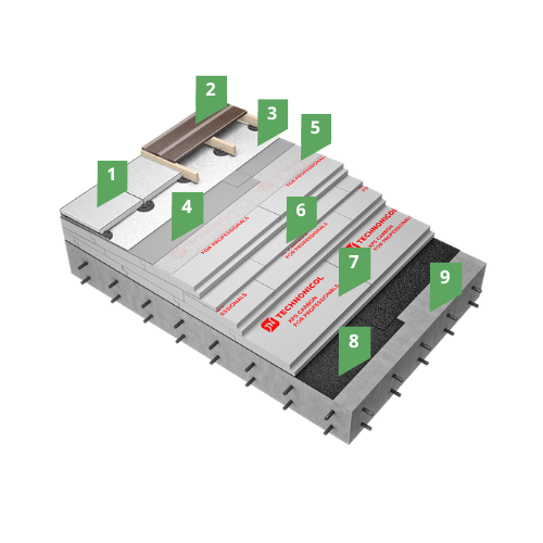 В качестве балласта и эксплуатируемого слоя в системе рекомендуется использовать - тротуарную плитку, толщиной не менее 40 мм, установленную на регулируемые опоры. Кровельный ковер выполняется из полимерной мембраны LOGICROOF V-GR, армированной стеклохолстом, которая обладает повышенной устойчивостью на прокол. Для дополнительной защиты полимерной мембраны от проколов на неё укладывается иглопробивной термообработанный геотекстиль ТЕХНОНИКОЛЬ развесом не менее 300 г/м2 и только затем эксплуатируемый слой. Для устройства теплоизоляционного слоя применяется утеплитель на основе экструзионного пенополистирола ТЕХНОНИКОЛЬ CARBON ECO, отличающийся высокими теплоизолирующими характеристиками и повышенной прочностью на сжатие. Между ПВХ мембранной и экструзионным пенополистиролом необходимо предусмотреть разделительный слой – стеклохолст, развесом не менее 100 г/м2. В качестве пароизоляции по бетонному основанию применяется наплавляемый материал Технобарьер. Он надежно защищает кровельный пирог от насыщения паром, при этом устойчив к возможным механическим повреждениям в условиях монтажа. Гибкость материала до минус 20 °С делает возможным устройство пароизоляции при отрицательных температурах.