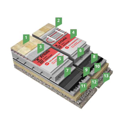 Данная система состоит из двух слоев битумно-полимерной гидроизоляционной мембраны Техноэласт ФУНДАМЕНТ, наплавленной на огрунтованную поверхность бетонной подготовки. В качестве теплоизоляционного слоя в системе применяется экструзионный пенополистирол ТЕХНОНИКОЛЬ CARBON ECO, который укладывается непосредственно на гидроизоляционный слой и выполняет функцию теплоизоляции.