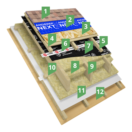 Система мансарда по деревянной стропильной системе с высококачественным покрытием из композитной черепицы ТЕХНОНИКОЛЬ LUXARD. Основание под композитную черепицу – обрешетка из бруса 50*50 мм с шагом 367 мм под оба типа панелей LUXARD. В качестве утеплителя в системе используются легкие негорючие плиты из каменной ваты ТЕХНОЛАЙТ ЭКСТРА. Пленка ТЕХНОНИКОЛЬ АЛЬФА ТОП, расположенная над утеплителем, защищает его от проникновения влаги, выдувания тепла и фракций утеплителя ветром, повышает энергоэффективность конструкции. Для создания вентзазоров могут использоваться БРУСКИ XPS ТЕХНОНИКОЛЬ CARBON ECO или деревянный брус. Слой пароизоляции - пленка ТЕХНОНИКОЛЬ АЛЬФА ТОП, монтируемый со стороны теплого помещения, предотвращает диффузию пара в толщу ограждающих конструкций и защищает утеплитель от увлажнения.