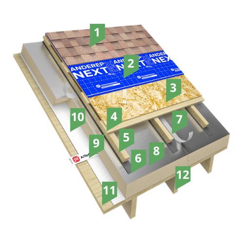 Особенностью системы является наличие непрерывного теплоизоляционного контура из легких и прочных большеформатных плит утеплителя марки LOGICPIR PROF, смонтированных поверх стропильных ног или декоративного потолочного настила. Благодаря такому способу монтажа минимизируется количество теплопроводных включений, снижается уровень теплопотерь и уменьшаются расходы на отопление. Также упрощается сам монтаж, исключающий подгонку утеплителя под шаг стропильных ног. Прочное алюминиевое покрытие плит PIR, позволяет отказаться от гидро-ветрозащитной мембраны, т.к. при проклейке стыков плит герметизирующей лентой получается непрерывный гидронепроницаемый слой, надежно предохраняющий всю конструкцию от увлажнения. Пароизоляционная пленка ТЕХНОНИКОЛЬ АЛЬФА Барьер, монтируется со стороны теплого помещения, предотвращает диффузию пара в толщу ограждающих конструкций и предохраняет от конденсации внутренней влаги в кровельной системе. Под многослойную черепицу на сплошной настил укладывается подкладочный ковер ANDEREP NEXT FIX, который выполняет функцию дополнительной гидроизоляции. В качестве дощатого настила под многослойную черепицу может использоваться ориентировано-стружечная плита (ОСП-3) или ее аналоги. Дощатый настил укладывается на разреженную обрешетку, выполненную с шагом не более 300 мм.