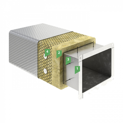 В конструкции в качестве теплоизоляции используется Мат ТЕХНО. Благодаря малому весу, материалом удобно работать на высоте и нагрузка на воздуховод остается минимальной. К воздуховоду привариваются приварные штифы, на которые одевается мат и фиксируется прижимными шайбами. Такой способ крепления обеспечивает надежную механическую фиксацию и стойкость к вибрациям воздуховода.