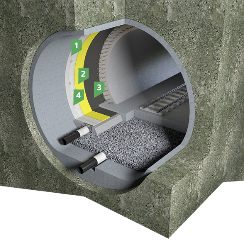 Эффективность такой гидроизоляционной системы в условиях необходимости отводить большое количество инфильтрационных вод, поступающих через дефекты первичной обделки, может быть значительно повышена путем включения в ее состав двухслойной дренажной мембраны PLANTER Geo, которая выполняет роль дренажного слоя, по которому вода стекает в дренажные трубы, уложенные вдоль тоннеля в его основании. Двухслойная дренажная мембрана PLANTER Geo должна устанавливаться вместо геотекстиля на поверхность первичной обделки из торкретбетона по своду и стенам.