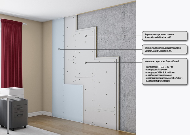 Бескаркасная система звукоизоляции стены «Gipslock 40» представляет собой бескаркасную конструкцию на основе комбинированной трехслойной панели толщиной 40 мм из гипсоволокнистых плит и базальтовой ваты Gipslock 40. Финишным слоем системы является лист звукоизоляционного гипсокартона SoundGuard Gipsofon.