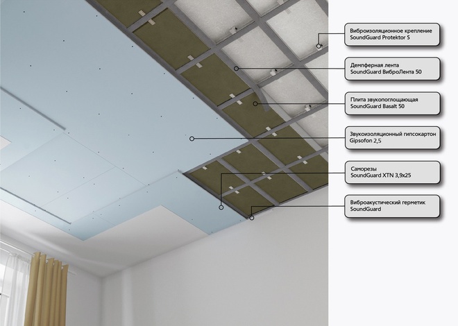К плите перекрытия с помощью виброподвесов SoundGuard Protector S крепится металлический каркас из профилей SoundGuard Strong. Места соприкосновения профилей с ограждающими конструкциями и звукоизоляционными листовыми материалами проклеиваются демпферной лентой SoundGuard ВиброЛента. Внутреннее пространство каркаса заполняется звукопоглощающей плитой SoundGuard Basalt. Финишным слоем системы является два листа звукоизоляционного гипсокартона Gipsofon .
