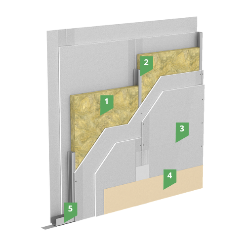 Звукоизолирующая способность перегородок характеризуется индексом звукоизоляции воздушного шума Rw, исчисляемого в децибелах (дБ). Чем выше его значение, тем лучше звукоизоляция помещения. Применение различных комбинаций толщин утеплителя и количества слоев обшивки позволяет снизить уровень воздушного шума до 59 дБ.