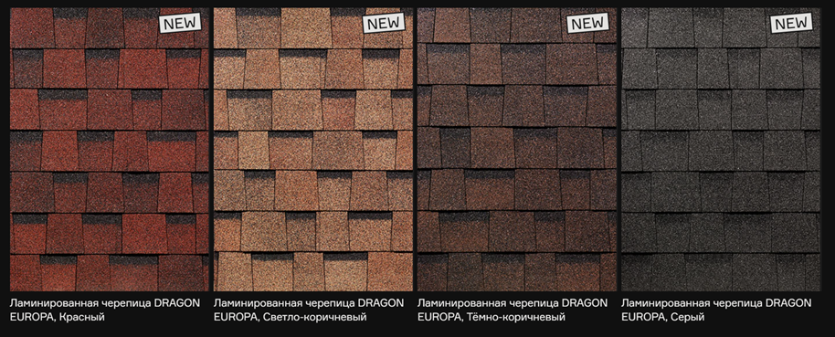 Гибкая черепица DRAGON EUROPA имеет особую выразительность благодаря большому гонту и авантажным цветам. К тому, же многослойная ламинированная черепица покрыта немного абстрактным рисунком и вам не придется выравнивать гонты по вертикали.